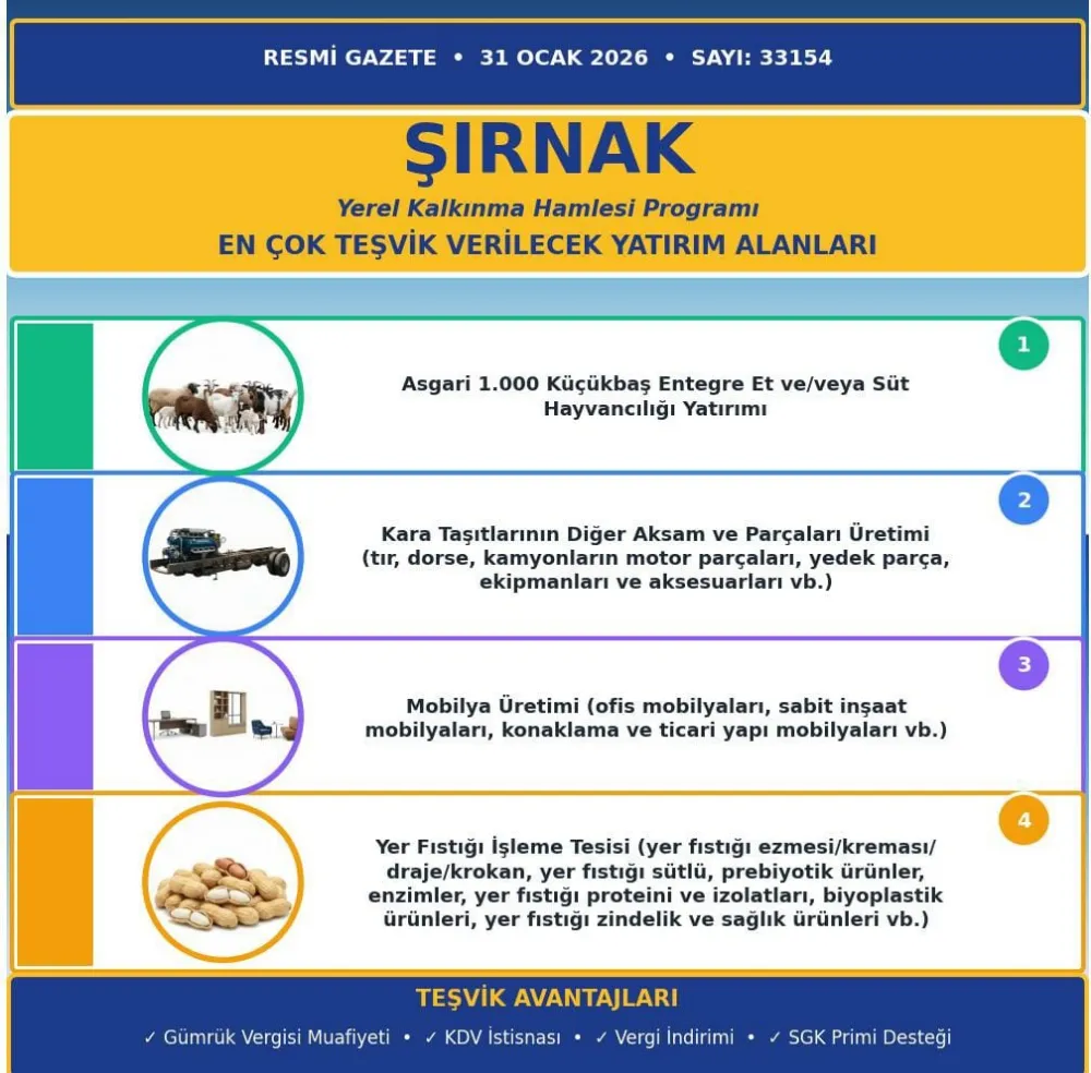 31 Ocak 2026 tarihli Resmi Gazete’de yayımlanan Yerel Kalkınma Hamlesi Programı kapsamında Şırnak’ta hayvancılık, otomotiv, mobilya ve yer fıstığı işleme yatırımları en yüksek teşvik kapsamına alındı; yatırımcılara vergi, KDV ve SGK desteği sağlanacak.